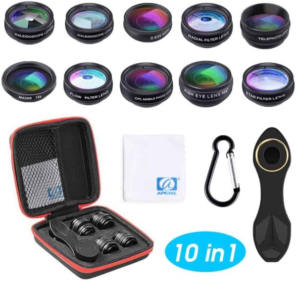 Lenti per Cellulare Clip On 10 In 1 Lente Kit, Obiettivo Grandangolare da 0,63x e Obiettivo Macro 15x, Fisheye da 198 °, Teleobiettivo, CPL, per iPhone/Android: 20,99€